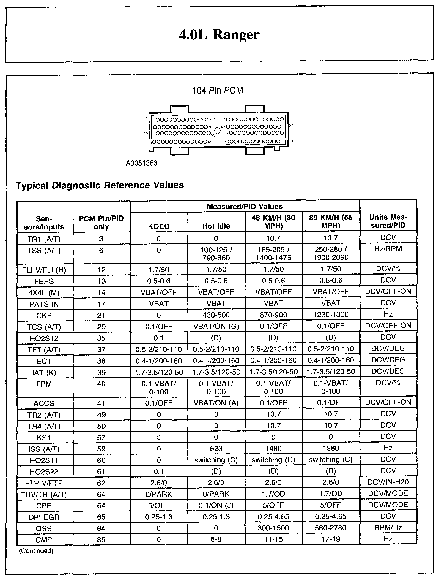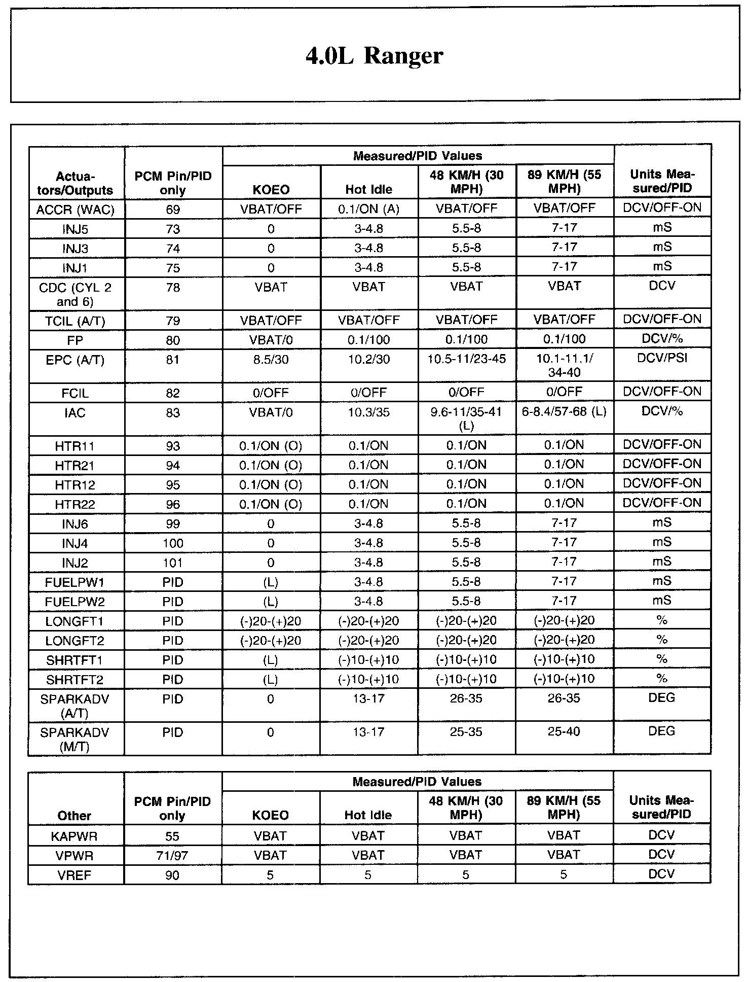 The Typical Diagnostic Reference Value Charts do not display fault parameter identifications (PIDs). These are PIDs which indicate a hard fault with the circuit. They display a value of YES or NO and are PIDs ending with the letter F.