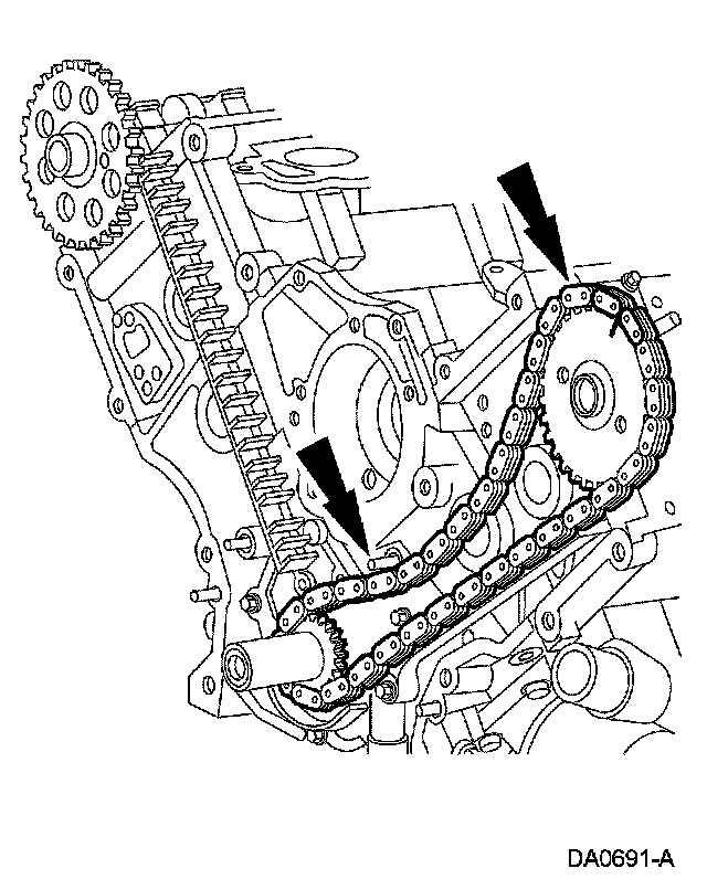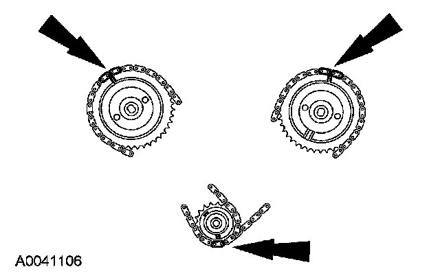 Position the RH timing chain on the camshaft sprocket. Make sure the camshaft sprocket timing mark is positioned between the 2 copper (marked) chain links.