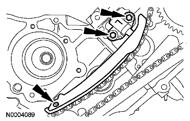 Position the LH timing chain tensioner arm on the dowel pin and install the LH timing chain tensioner.