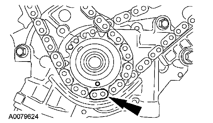Position the timing chain on the camshaft sprocket with the camshaft sprocket timing mark positioned between the 2 copper (marked) chain links.