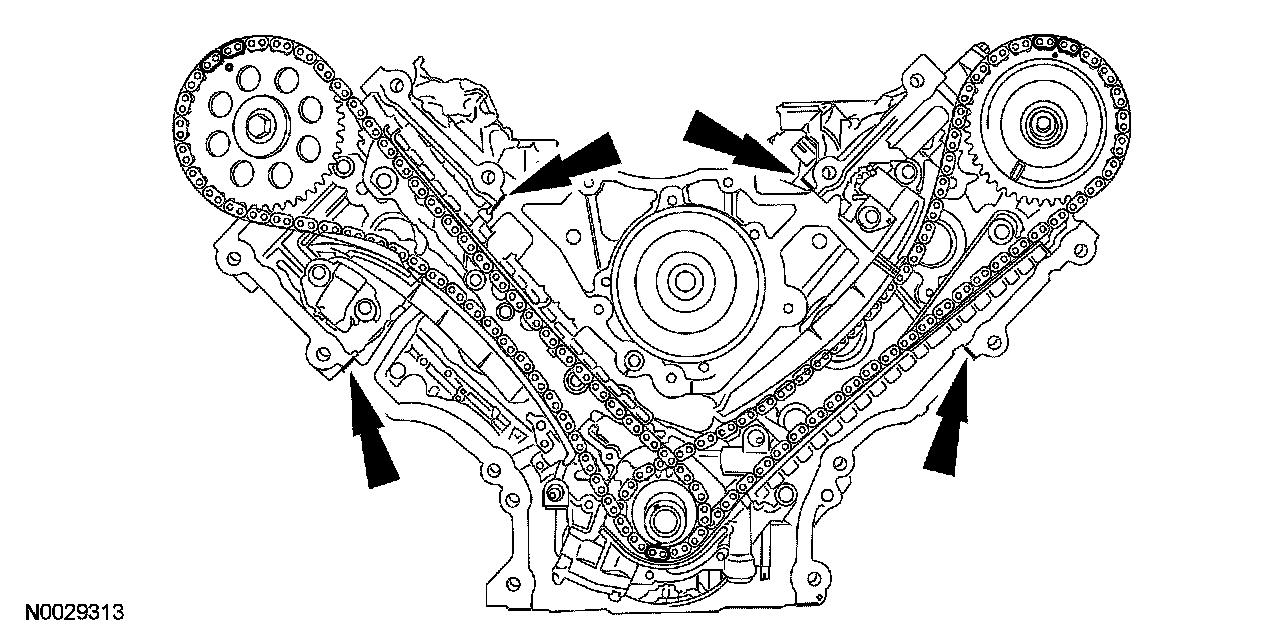 38. NOTE: The lower half of the timing chain must be positioned above the tensioner arm dowel.