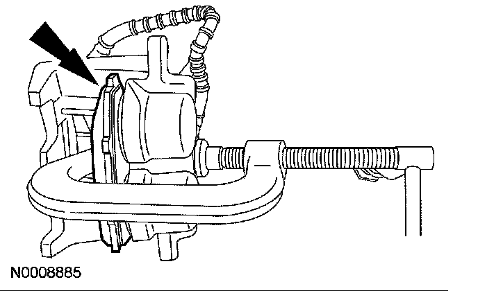 CAUTION: Do not allow the brake caliper to hang from the brake caliper flexible hose. Use a suitable tool to support the brake caliper.