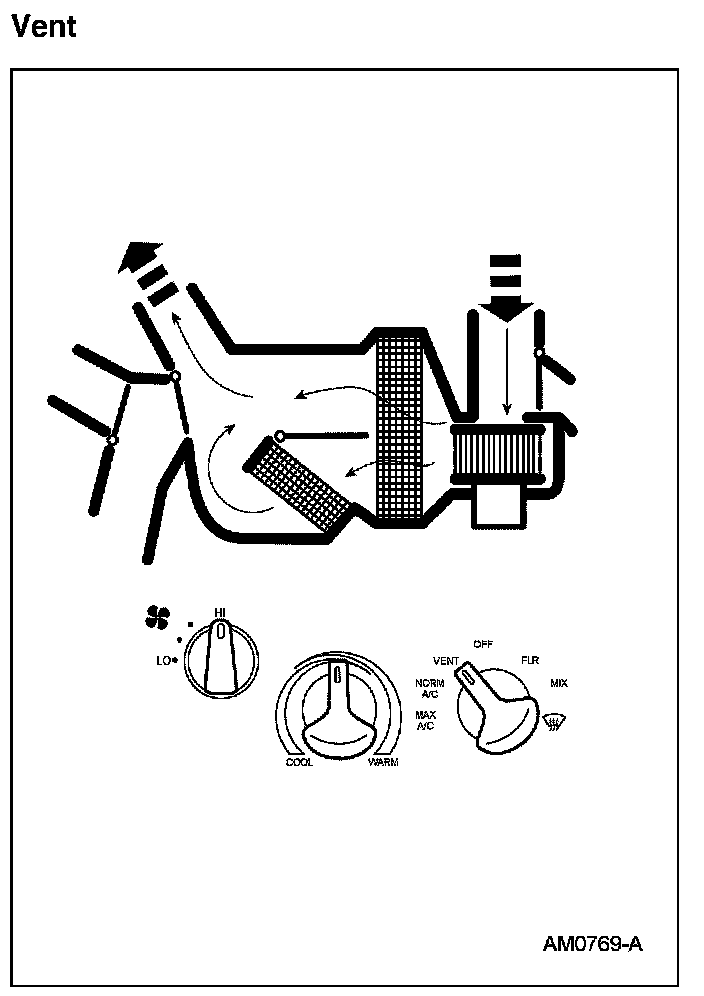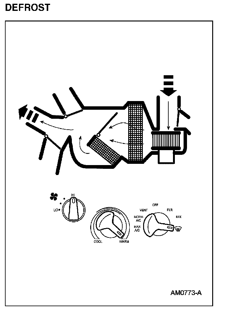 - Both the floor/defrost door and the floor/panel door are in the no vacuum position so that most of the incoming air is directed to the windshield defroster hose nozzle. There is also airflow to the side window demisters.