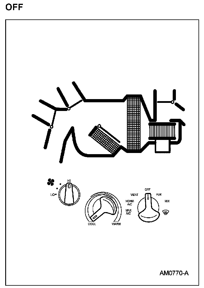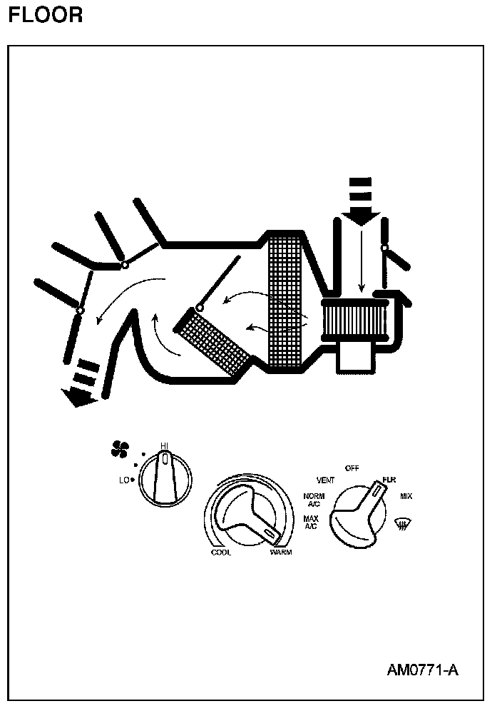 - The floor/defrost door is in the full vacuum position, directing all airflow to the heater outlet floor duct.