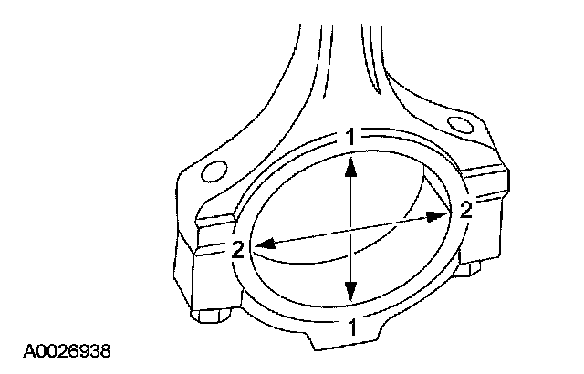 1. Tighten the bolts to specification, then measure the bore in 2 directions. The difference is the connecting rod bore out-of-round. Verify the out-of-round is within specification.
