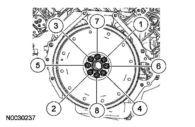 1. Position the flexplate and tighten the 8 bolts in 2 stages, in the sequence shown.