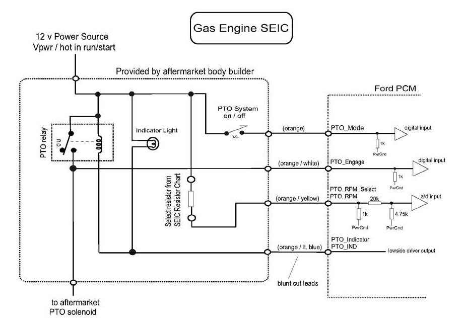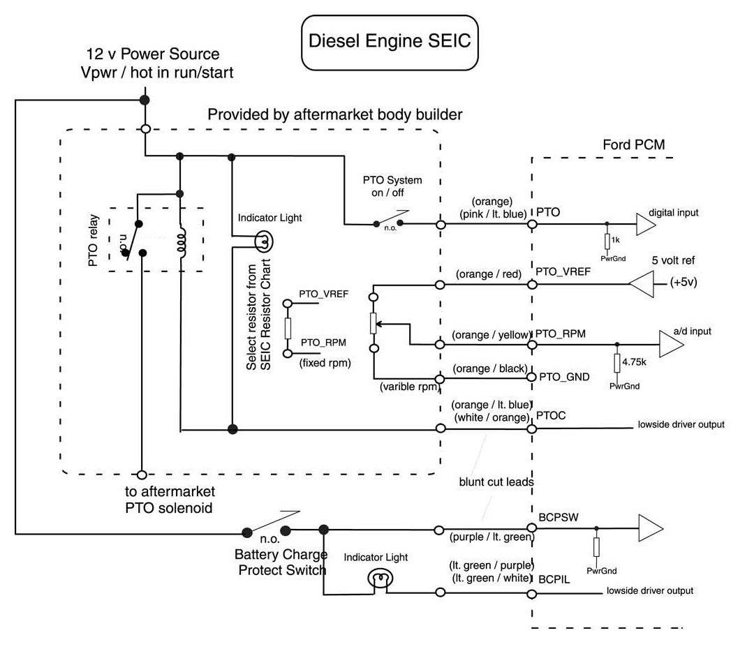 Wiring DiagramsThe following diagrams suggest a method to complete the SEIC circuits for gas and diesel engines. Where the wire color or PCM pin call-outs show two different colors or names, the top one refers to Super Duty F-Series vehicles and the bottom refers to E-Series vehicles.