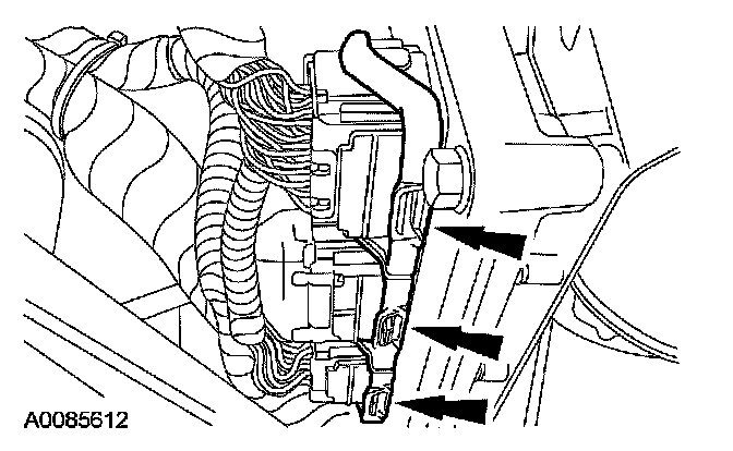7. Unlatch and disconnect the powertrain control module (PCM) electrical connectors.