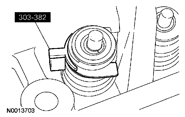 36. CAUTION: If one or both of the tensioner mounting bolts are loosened or removed, the tensioner-sealing bead must be inspected for seal integrity. If cracks, tears, separation from the tensioner body or permanent compression of the seal bead is observed, install a new tensioner.