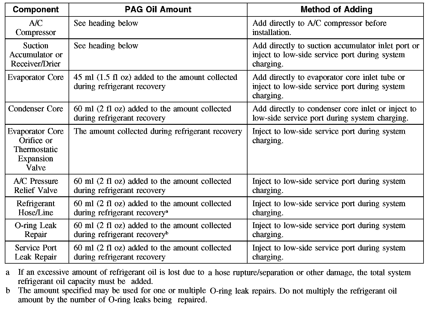 CAUTION: During normal A/C operation, oil is circulated through the system with the refrigerant, and a small amount is retained in each component. If certain components of the system are removed, some of the refrigerant oil will go with the component. To maintain the original total oil charge, it is necessary to compensate for the oil lost by adding oil to the system with the new part.