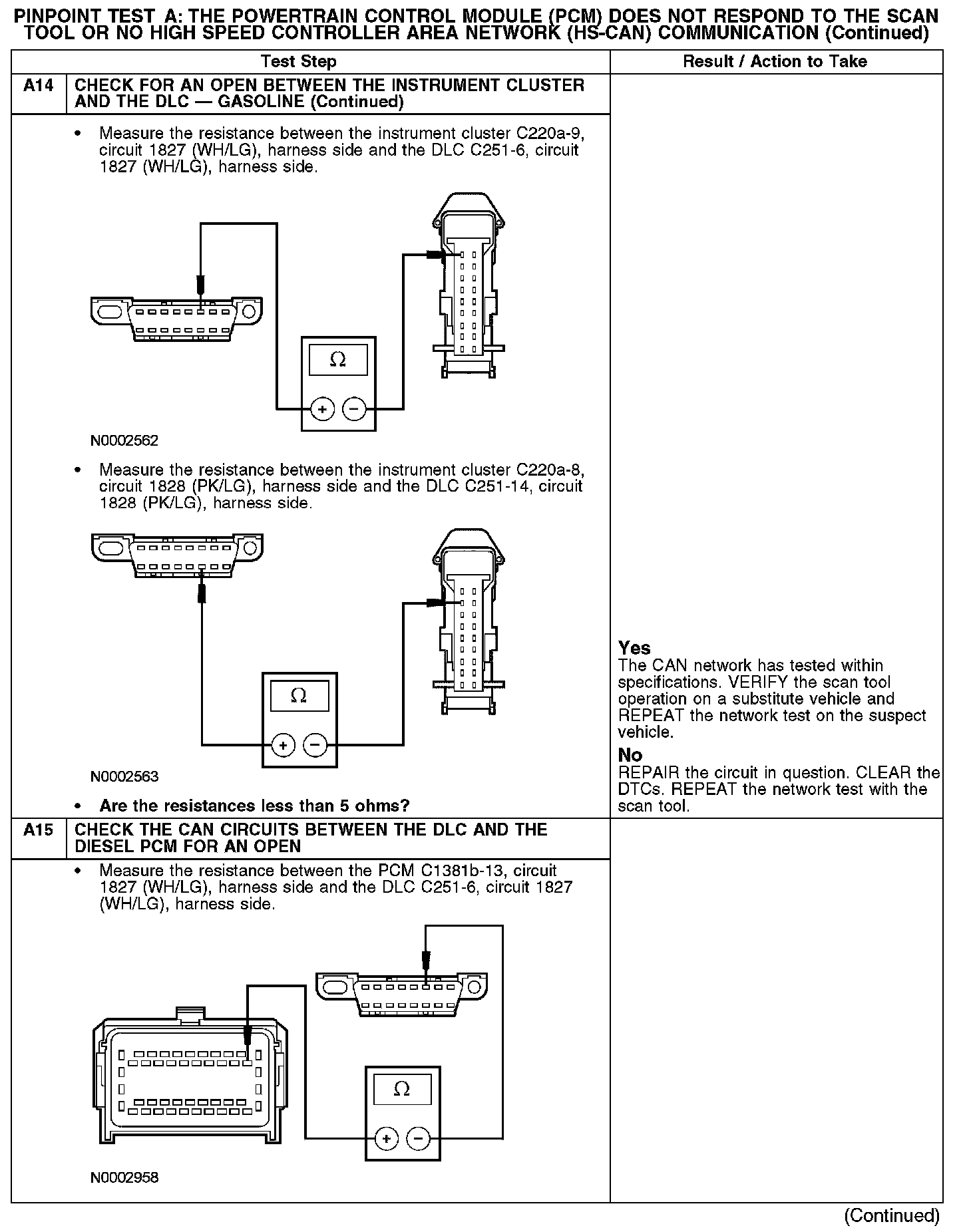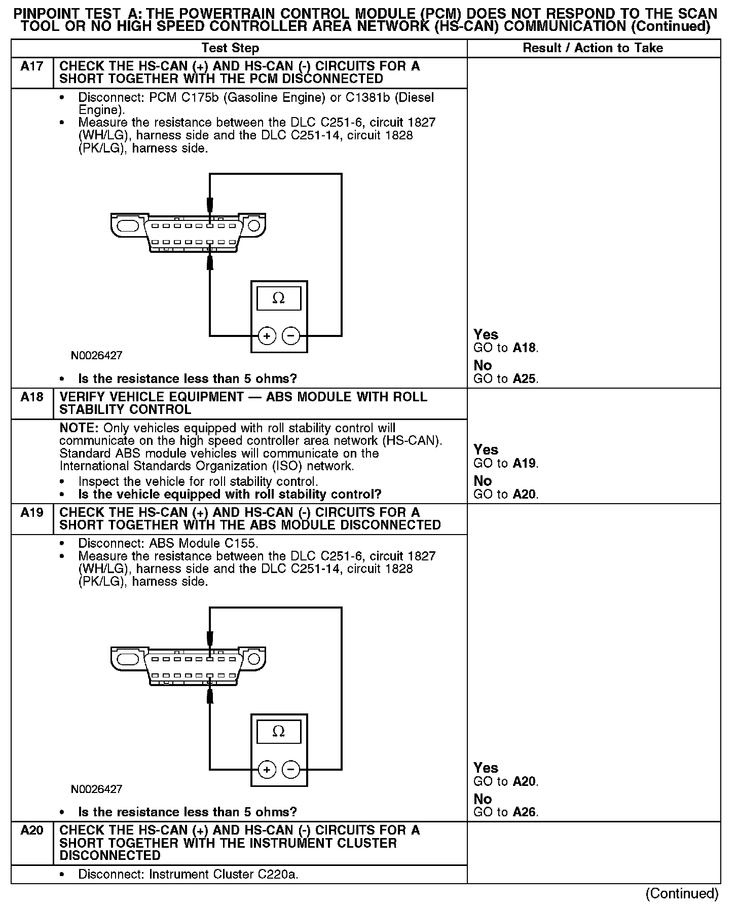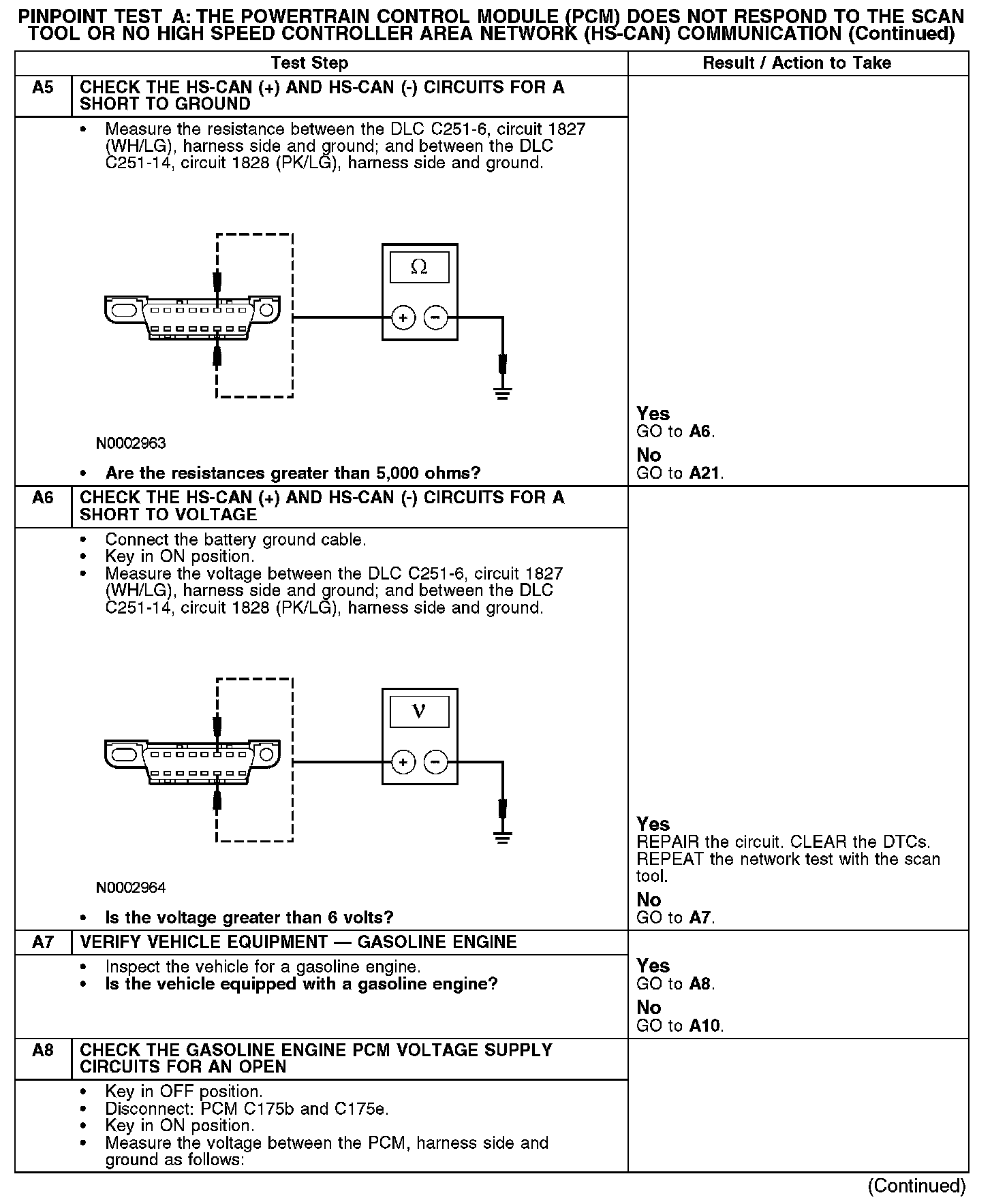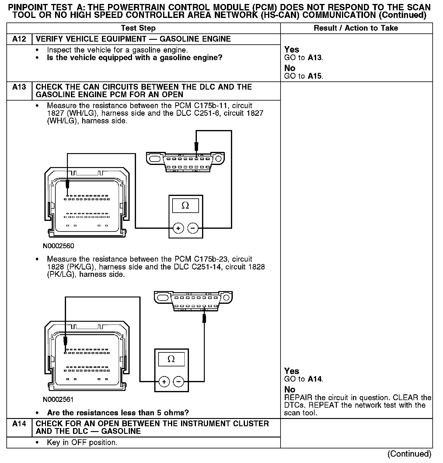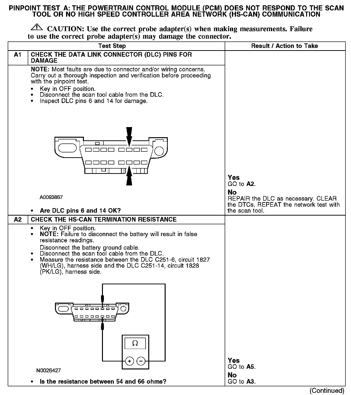 PINPOINT TEST A: THE POWERTRAIN CONTROL MODULE (PCM) DOES NOT RESPOND TO THE SCAN TOOL OR NO HIGH SPEED CONTROLLER AREA NETWORK (HS-CAN) COMMUNICATIONA1-A2: