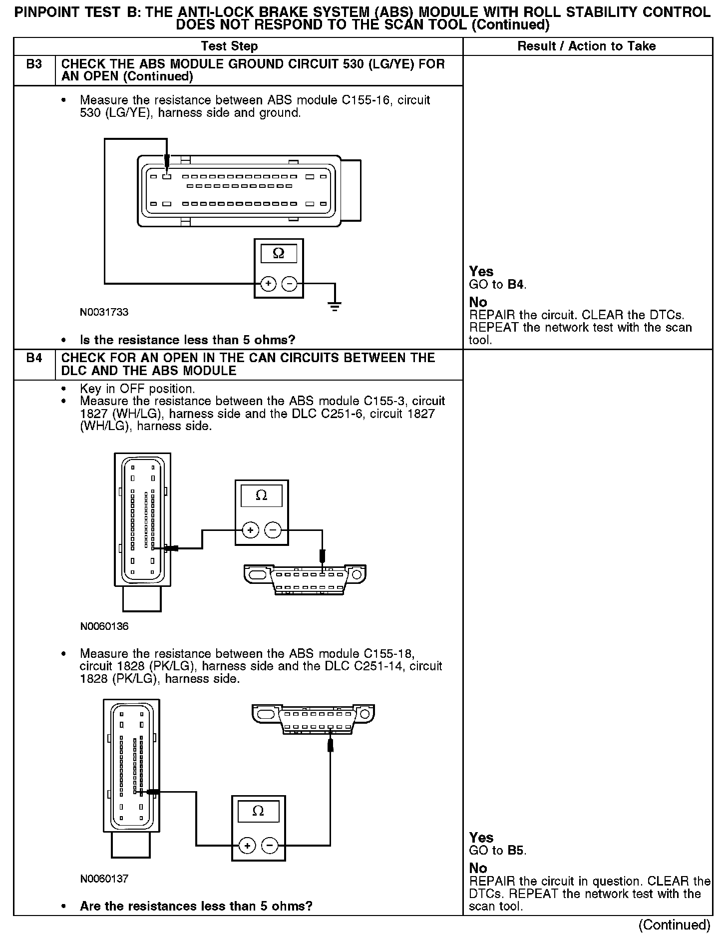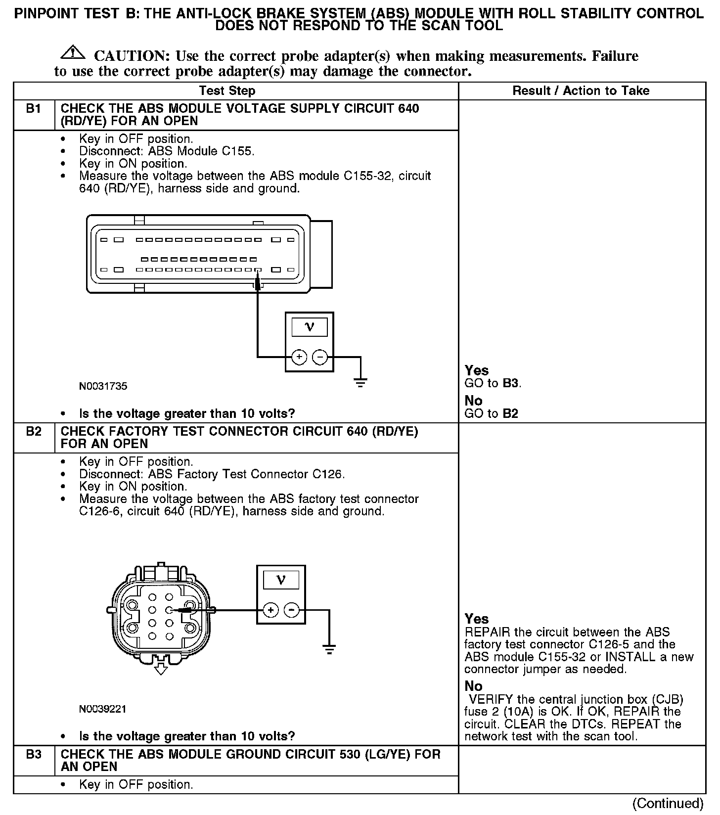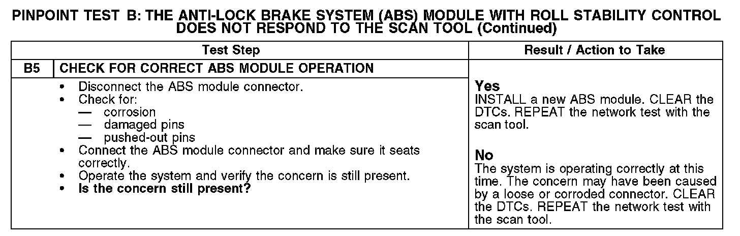 PINPOINT TEST B: THE ANTI-LOCK BRAKE SYSTEM (ABS) MODULE WITH ROLL STABILITY CONTROL DOES NOT RESPOND TO THE SCAN TOOL