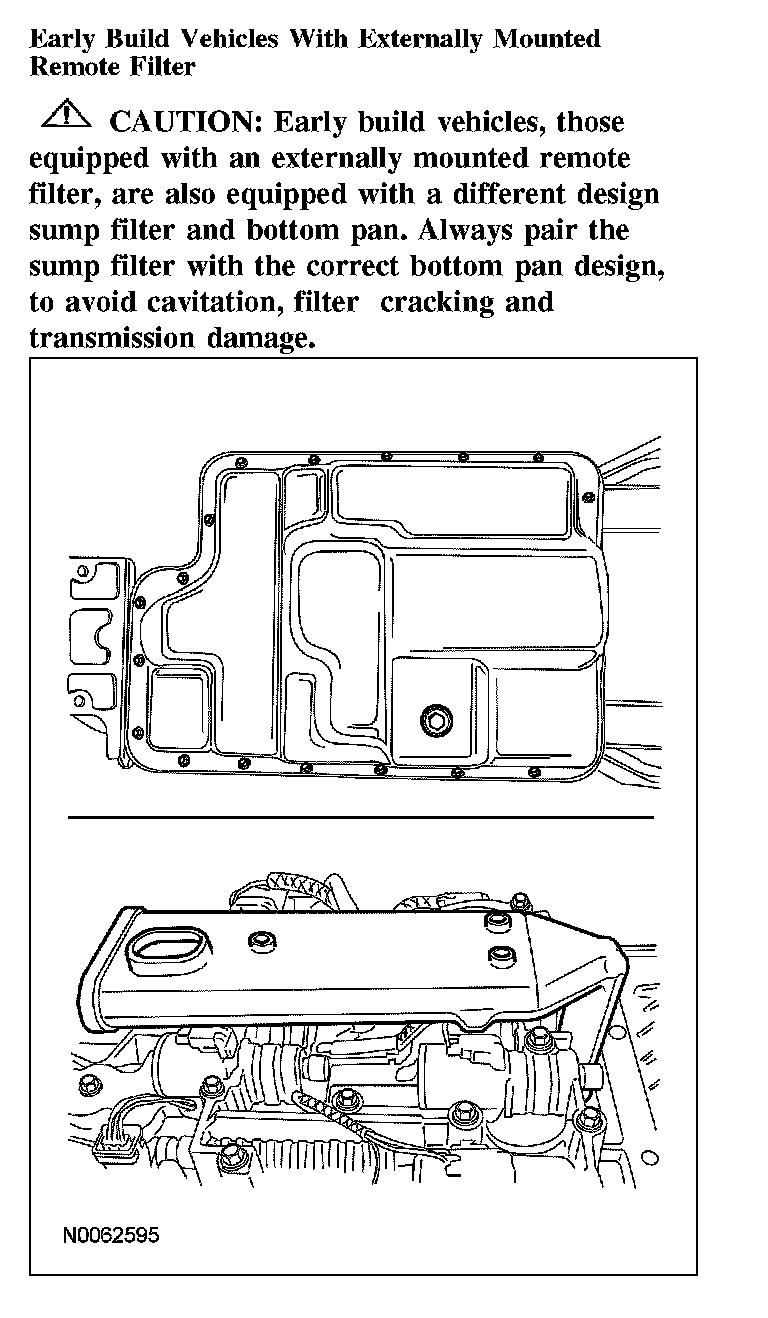 CAUTION: Early build vehicles, those equipped with an externally mounted remote filter, are also equipped with a different design sump filter and bottom pan. Always pair the sump filter with the correct bottom pan design, to avoid cavitation, filter cracking and transmission damage.