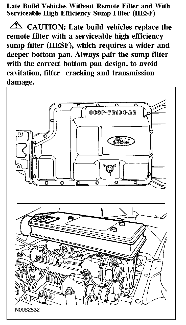 CAUTION: Late build vehicles replace the remote filter with a serviceable high efficiency sump filter (HESF), which requires a wider and deeper bottom pan. Always pair the sump filter with the correct bottom pan design, to avoid cavitation, filter cracking and transmission damage.