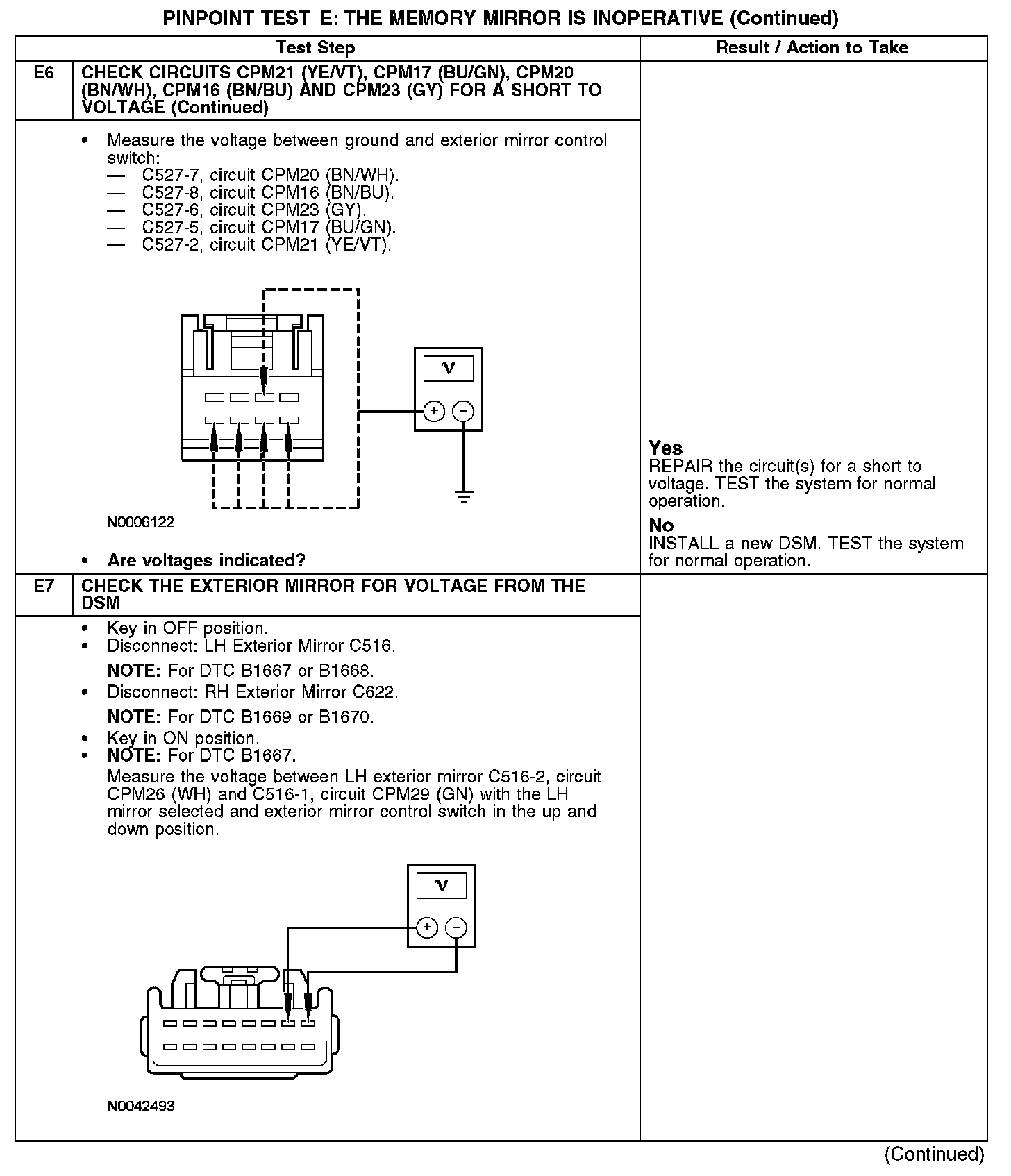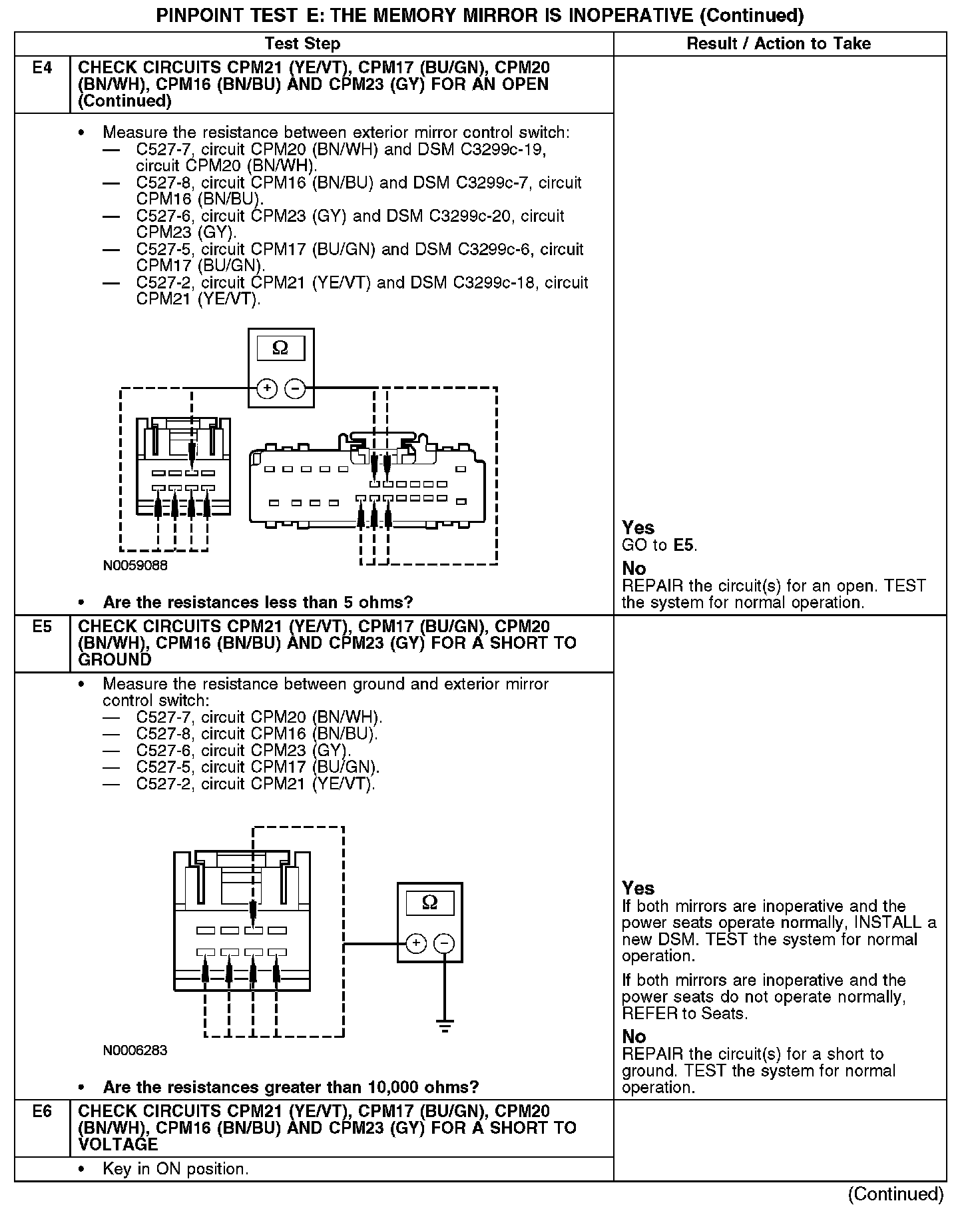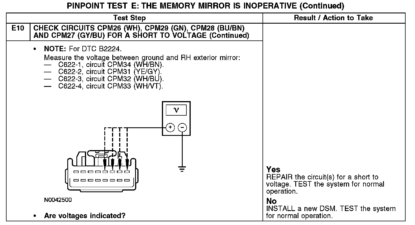 Under normal operation, the exterior mirror control switch receives power from circuit SBP12 (WH/OG) and ground from circuit GD133 (BK). The exterior mirror control switch sends input to the driver seat module (DSM) for the LH exterior mirror by switching power and ground to circuits CPM16 (BN/BU), CPM17 (BU/GN) and CPM23 (GY); and for the RH exterior mirror by switching power and ground to circuits CPM20 (BN/WH), CPM21 (YE/VT) and CPM23 (GY). The DSM will then send the appropriate power and ground for the LH exterior mirror motor down/up circuits CPM29 (GN), CPM26 (WH) and right/left circuits CPM28 (BU/BN) and CPM27 (GY/BU); or the RH exterior mirror motor down/up circuits CPM34 (WH/BN), CPM31 (YE/GY) and right/left circuits CPM32 (WH/BU) and CPM33 (WH/VT).