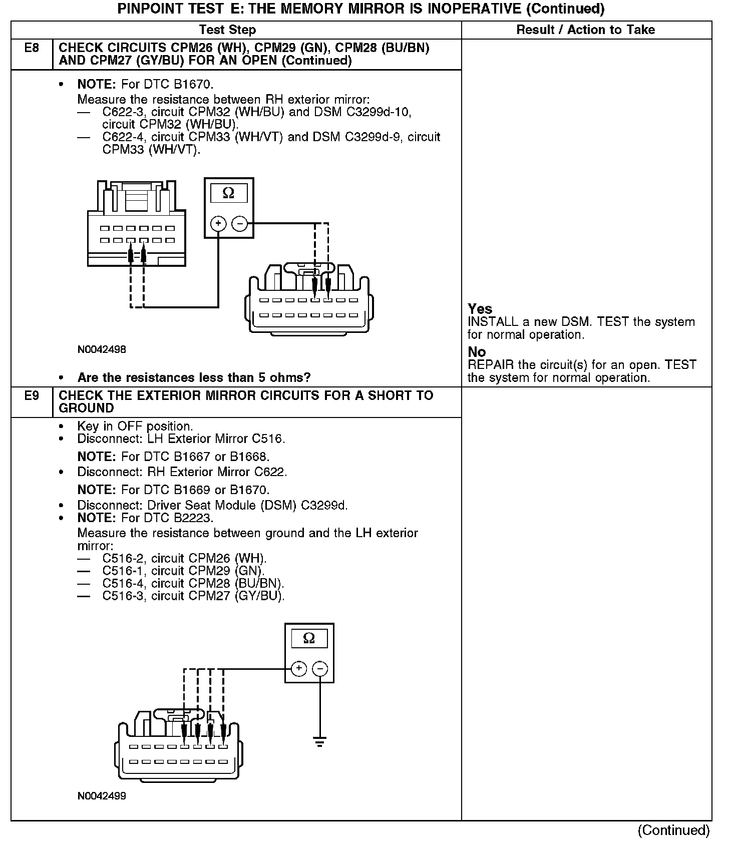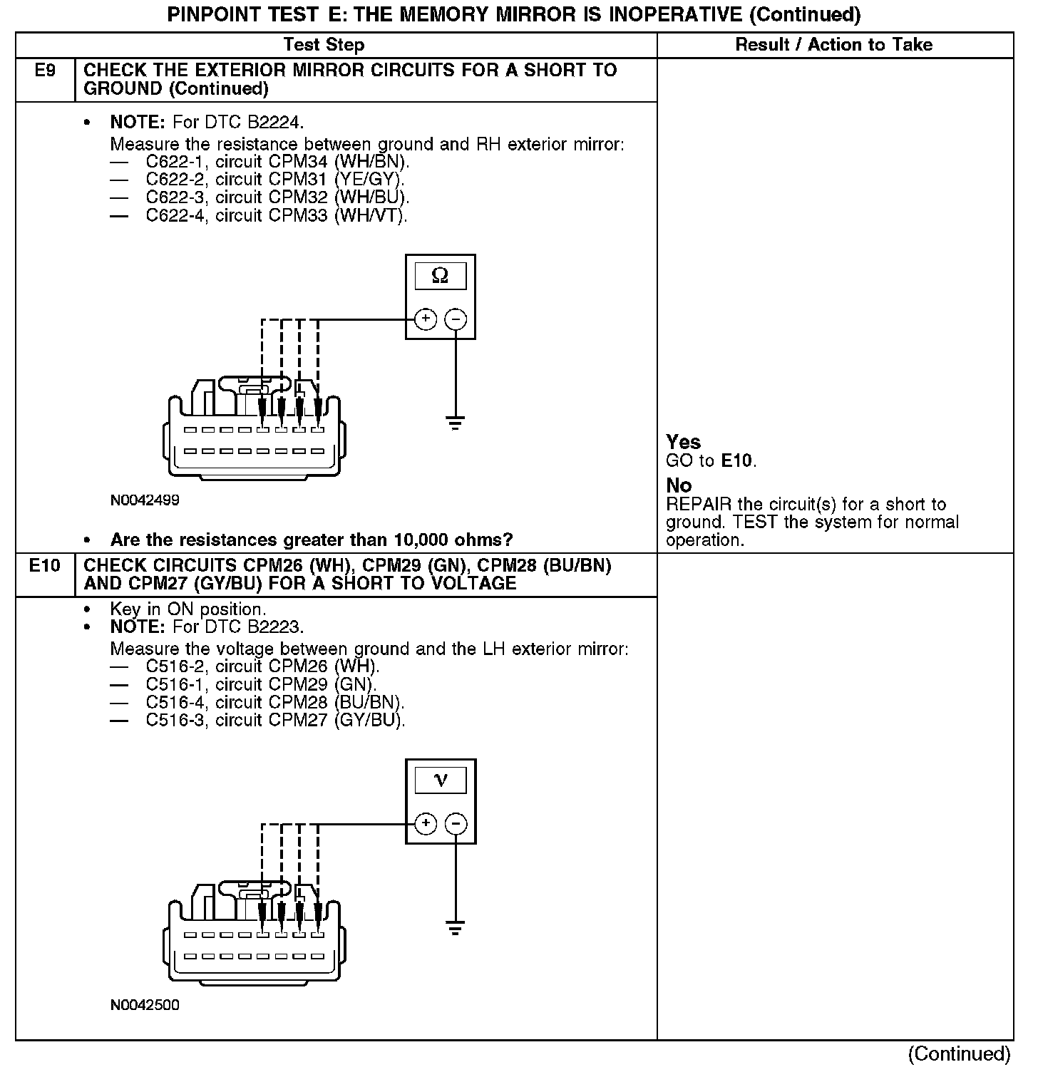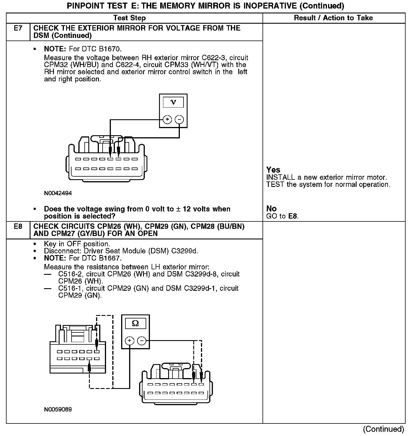 Under normal operation, the exterior mirror control switch receives power from circuit SBP12 (WH/OG) and ground from circuit GD133 (BK). The exterior mirror control switch sends input to the driver seat module (DSM) for the LH exterior mirror by switching power and ground to circuits CPM16 (BN/BU), CPM17 (BU/GN) and CPM23 (GY); and for the RH exterior mirror by switching power and ground to circuits CPM20 (BN/WH), CPM21 (YE/VT) and CPM23 (GY). The DSM will then send the appropriate power and ground for the LH exterior mirror motor down/up circuits CPM29 (GN), CPM26 (WH) and right/left circuits CPM28 (BU/BN) and CPM27 (GY/BU); or the RH exterior mirror motor down/up circuits CPM34 (WH/BN), CPM31 (YE/GY) and right/left circuits CPM32 (WH/BU) and CPM33 (WH/VT).