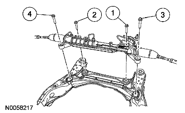 1. Position the steering gear and tighten the 4 steering gear bolts to 103 Nm (76 ft. lbs) in the sequence shown.