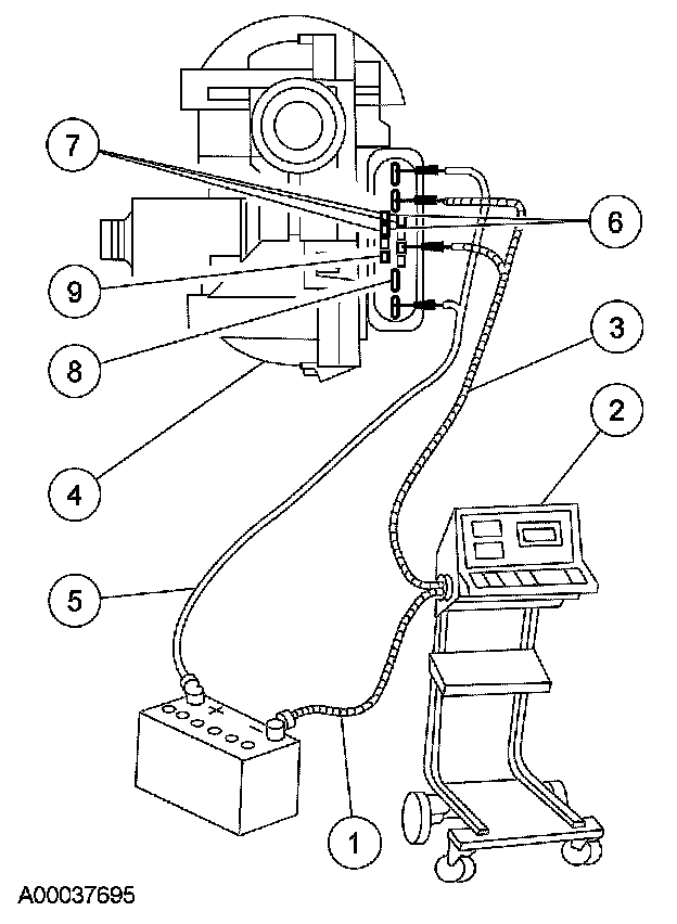 Test the high speed mode by connecting a separate set of test leads from battery ground (-) post to windshield wiper motor (4) component side pins 1, 9 and 10 (7). When these pins are grounded, the windshield wiper motor operation should now be in high speed mode.