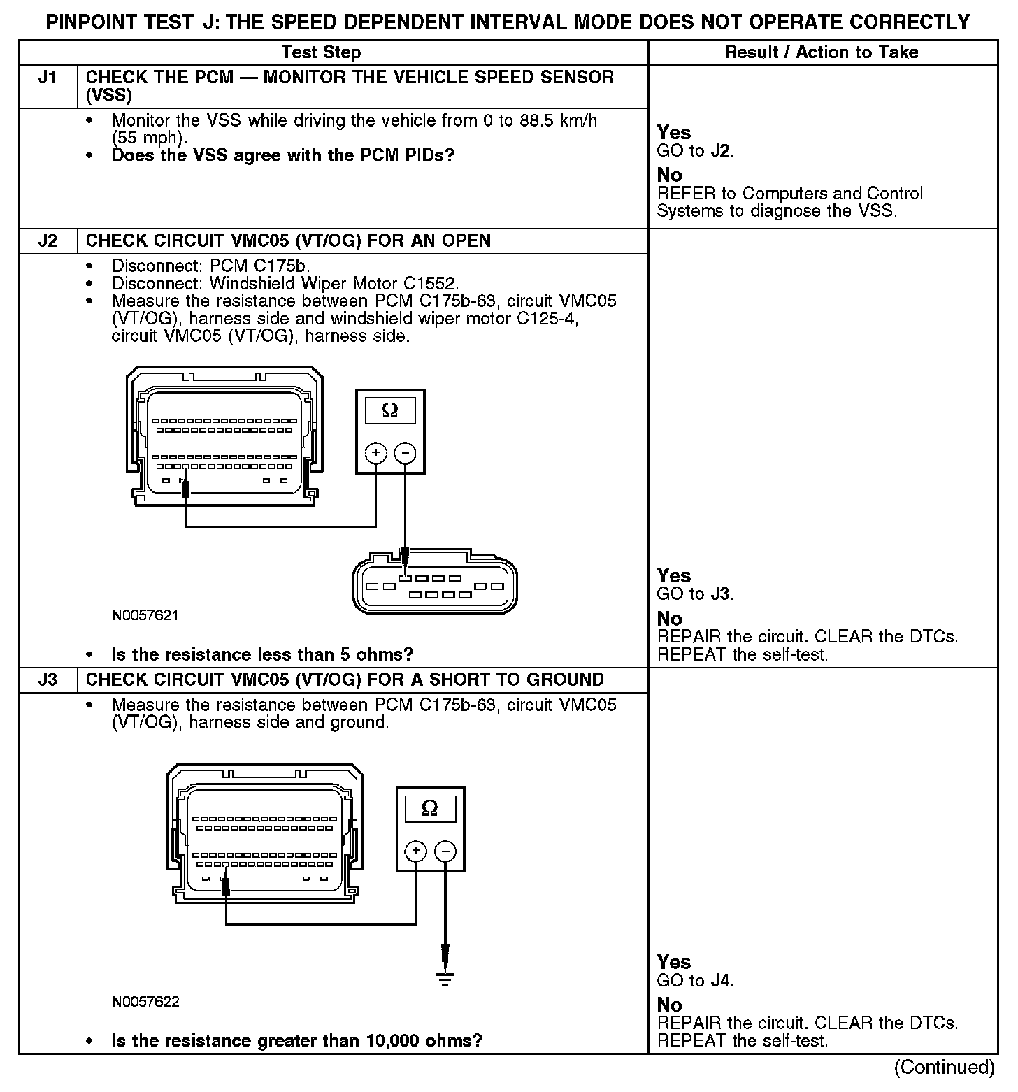 Under normal operation, the windshield wiper motor receives vehicle speed information from the powertrain control module (PCM) through circuit VMC05 (VT/OG). The windshield wiper motor electronics then determine the speed of the windshield wiper motor. The speed dependant wipers function in all INT modes except INT 1.
