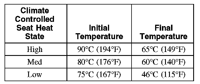 The temperature differences between the individual heated and cooled settings is minimal. For example, it is difficult to distinguish between low cool and medium cool settings. Measuring seat temperature at different settings is possible by monitoring the CCSM PIDs using the scan tool.