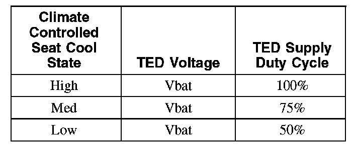 Each driver and front passenger seat cushion is equipped with a thermo-electric device (TED) assembly that includes a seat blower (fan motor, serviced as an assembly with the TED). Similarly, each driver and front passenger seat backrest is also equipped with its own TED assembly with blower. Cabin air is drawn through the blower and distributed to each of the TED modules located in the seat cushion and backrest. The TEDs then heat or cool the air. The air is then directed into the foam pad and manifold where it is distributed along the surface of the cushion and backrest of the seat. Once the system is activated, the CCSM uses a set of flexible algorithms to control the heating/cooling modes and the blower speed dependant on the EATC seat switch settings.