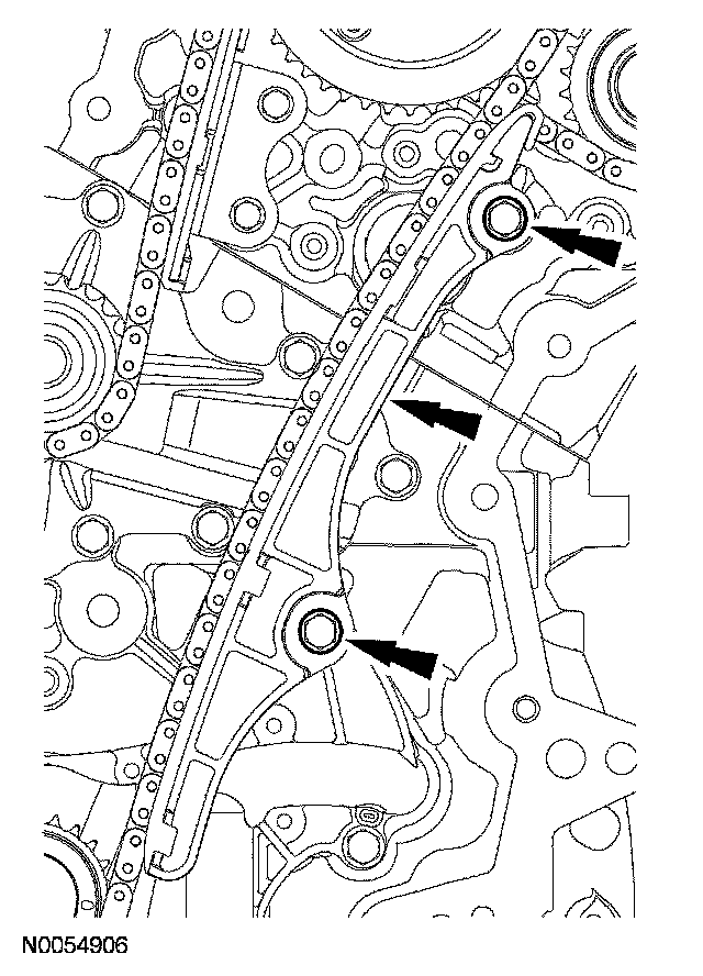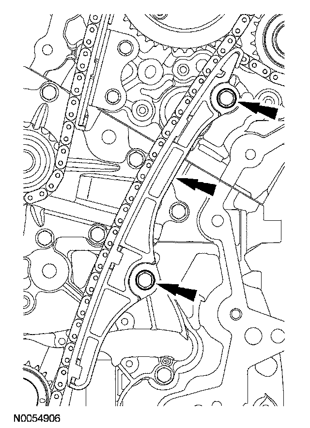 10. Remove the 2 bolts and the lower LH primary timing chain guide.