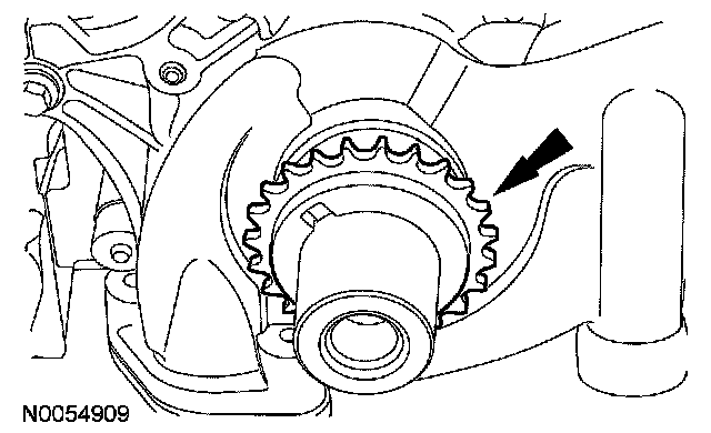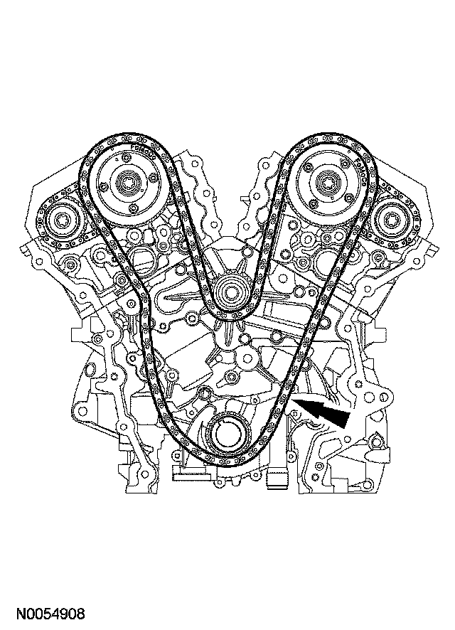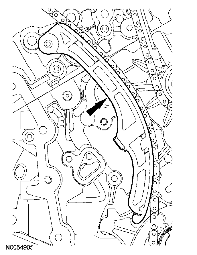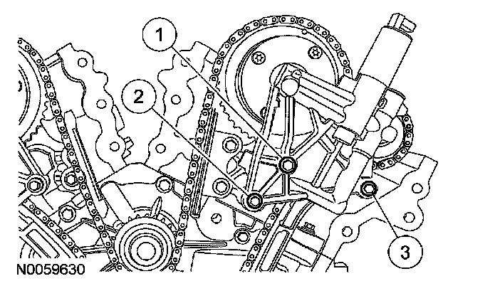 4. Install the primary timing chain with the colored links aligned with the timing marks on the VCT assemblies and the crankshaft sprocket.
