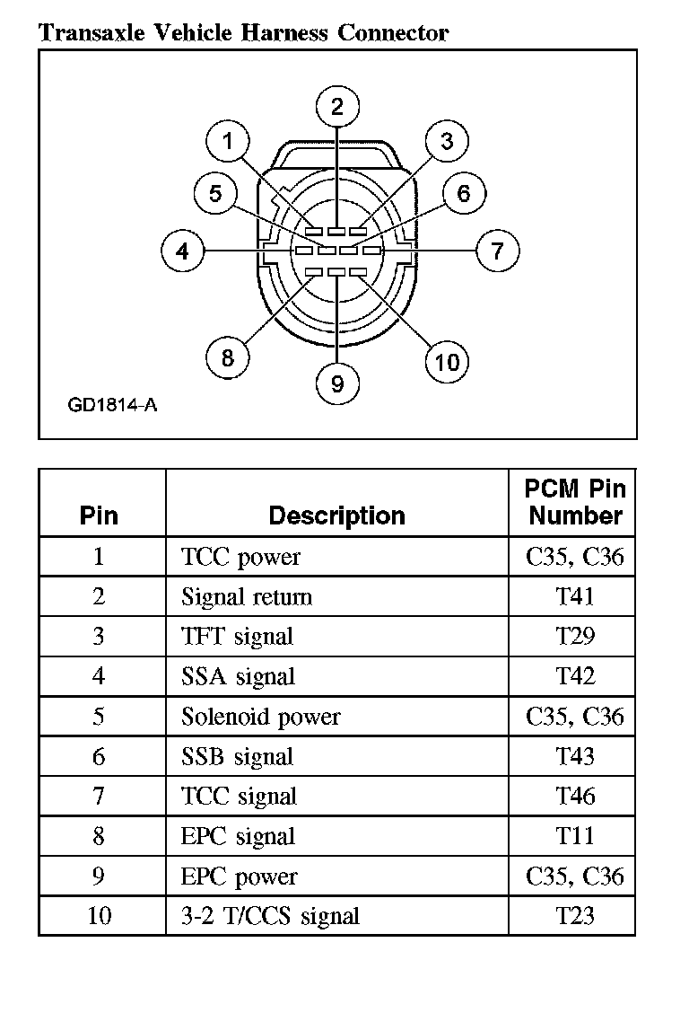 Transaxle Connector LayoutsNOTE: This vehicle is equipped with a new style powertrain control module. This is a 50-pin control module with 3 separate connectors. One connector for the chassis (C), one for the transaxle (T) and one for the body (B). The pin numbers listed throughout these pinpoint tests will have the letter C and T to designate the connector.
