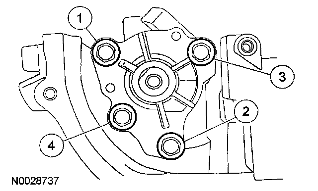 Install the oil pump assembly. Tighten the bolts in the sequence shown in 2 stages: