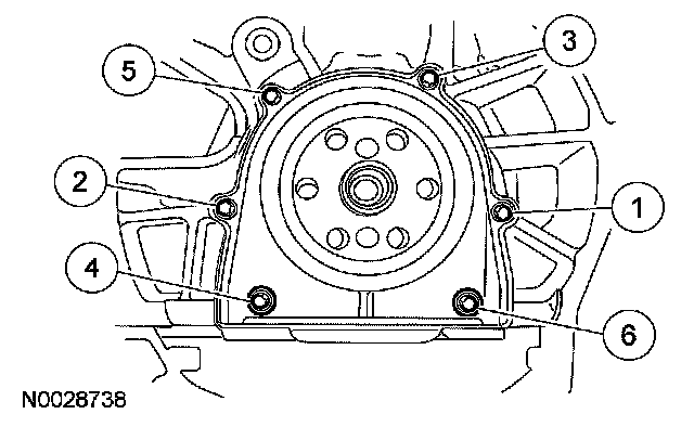 35. Tighten the crankshaft rear oil seal retainer bolts in the sequence shown.