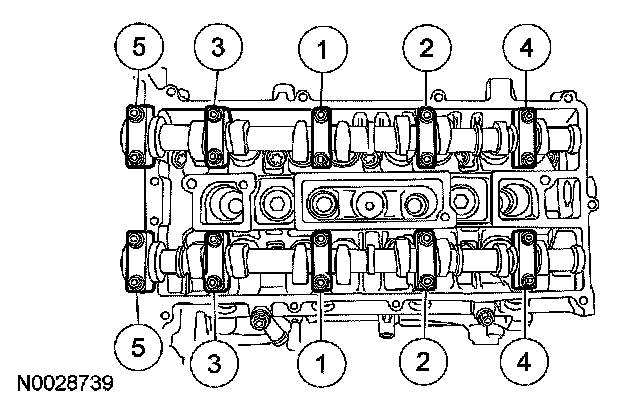 ^ Stage 1: Tighten the camshaft bearing cap bolts one at a time until finger tight.
