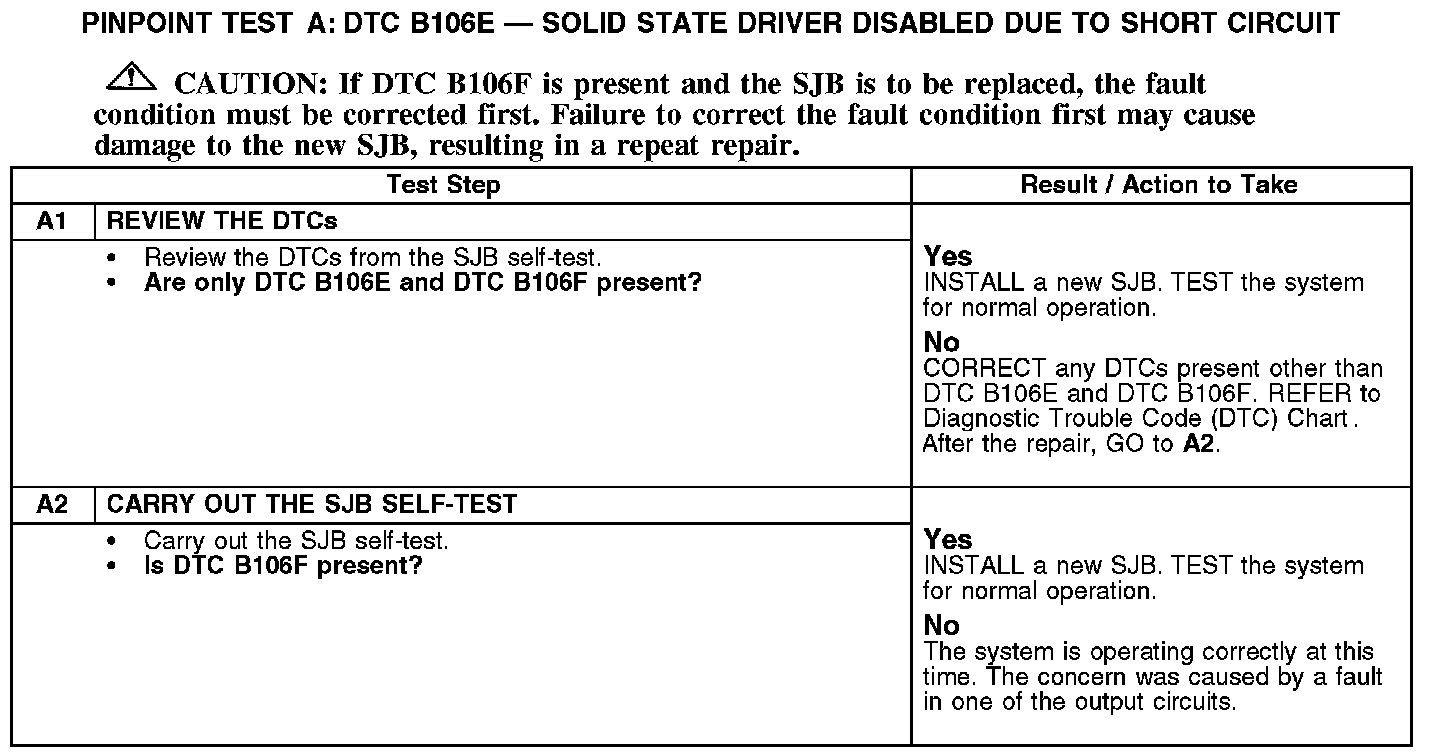 DTC B106F - sets when one or more output functions are permanently disabled due to a repetitive circuit overload fault. DTC B106F will be set with DTC B106E. When DTC B106F is present, the SJB must be replaced after the fault condition has been corrected.