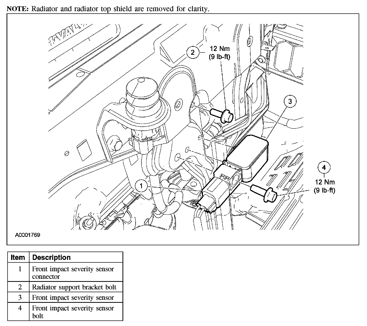 3. WARNING: The tightening torque of the air bag front impact severity sensor retaining bolt is critical for correct system operation.