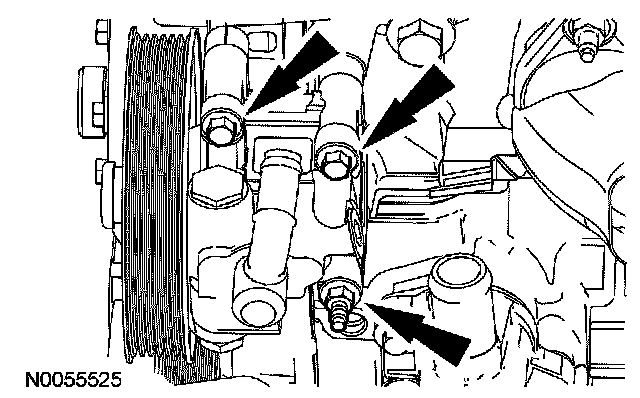 14. Position the power steering pump and install the stud bolt and the 2 bolts.