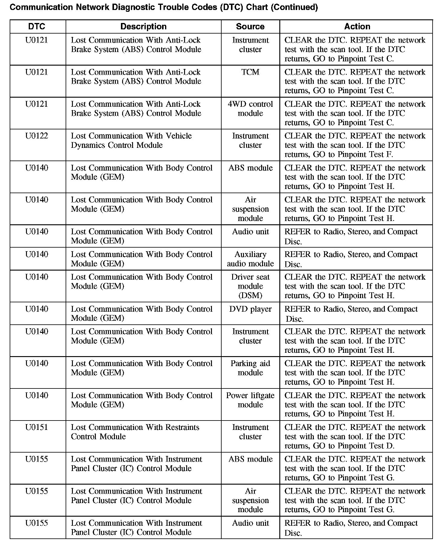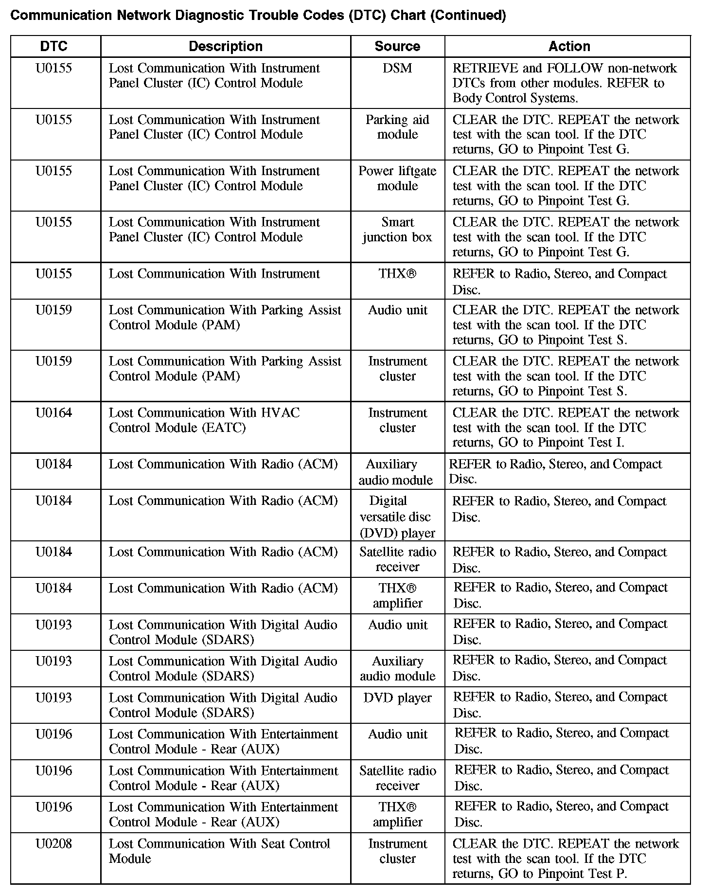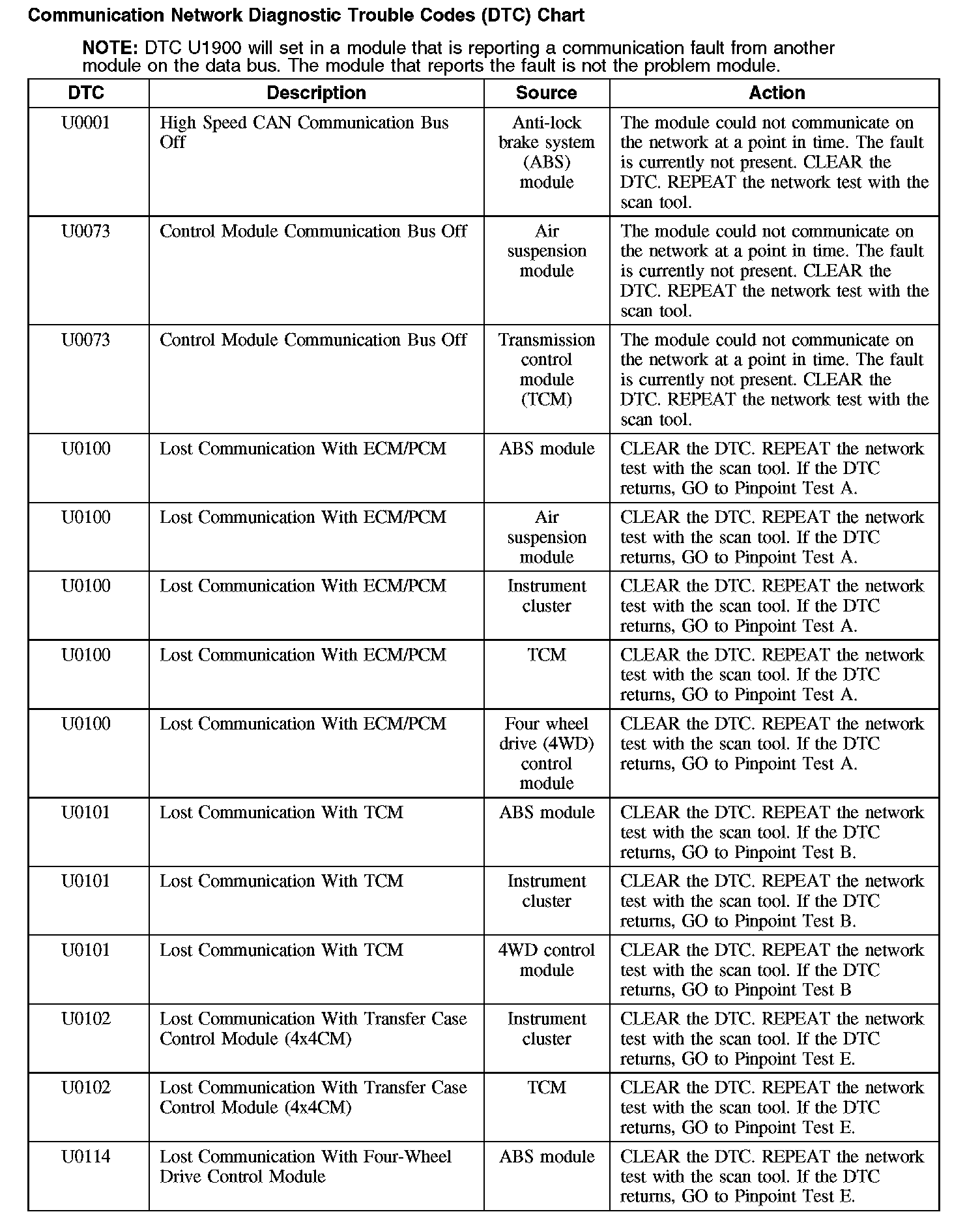 Communication Network Diagnostic Trouble Codes (DTC) Chart