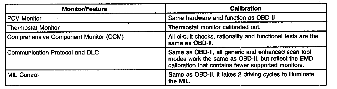 Starting with the 2007 model year, vehicles not required to comply with OBD-II requirements use an EMD system. EMD systems are used on all California and Federal gas and diesel on-road heavy duty engines used in vehicles over 6,350 kg (14,000 lb) GVWR. EMD systems are required to functionally monitor the fuel delivery system, EGR system, particulate matter trap, as well as emission related PCM inputs for circuit continuity and rationality, and emission related outputs for circuit continuity and functionality. For gasoline engines, which have no particulate matter trap, EMD requirements are very similar to previous OBD-I system requirements. As such, OBD-I system principles are employed, with the addition of some comprehensive component monitor (CCM) rationality and functionality checks. EMD vehicles use the same PCM, controller area network (CAN), data link connector (DLC) and PCM software as the corresponding OBD-II vehicles. Differences between EMD and OBD-II vehicles may be removal of the rear oxygen sensor(s), fuel tank pressure sensor, canister vent solenoid, and PCM calibration. The table lists what monitors and functions have been altered for the EMD calibration.