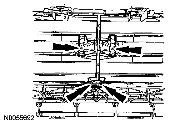 2. Remove the 4 bumper assembly-to-grille bracket retainer nuts and the bumper assembly-to-grille bracket.