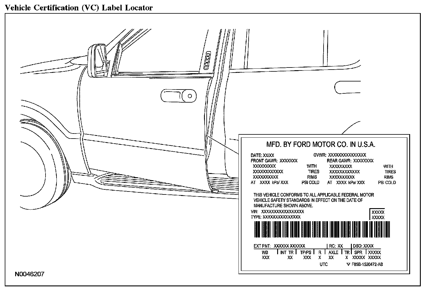 The vehicle certification (VC) label contains information on the manufacturer name, the month and year of manufacture, the certification statement and the VIN. This label also includes gross vehicle weight (GVWR) information.