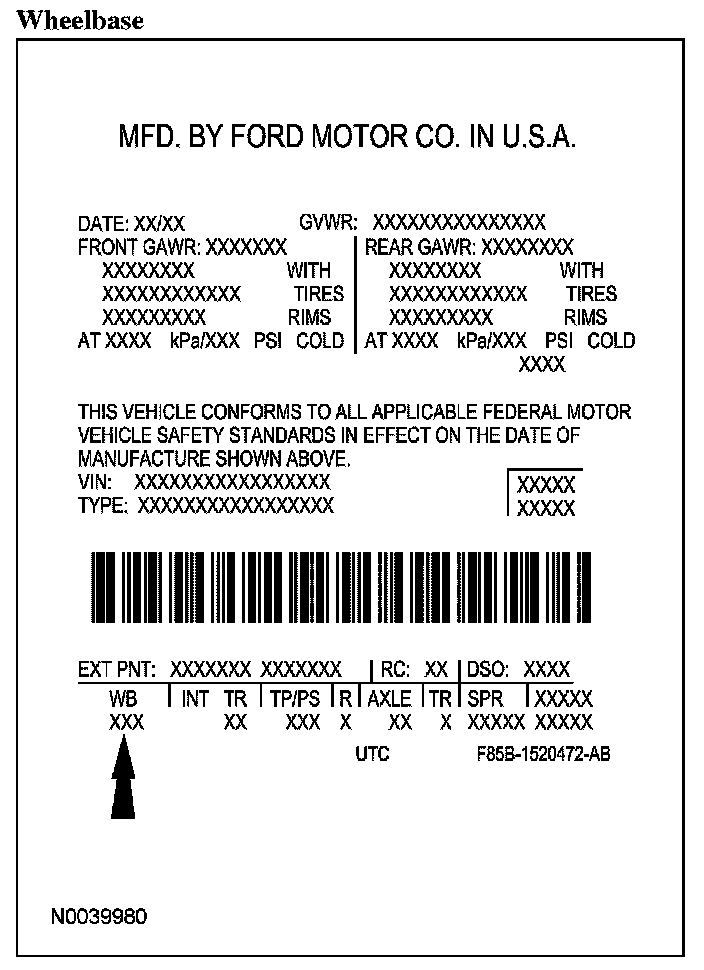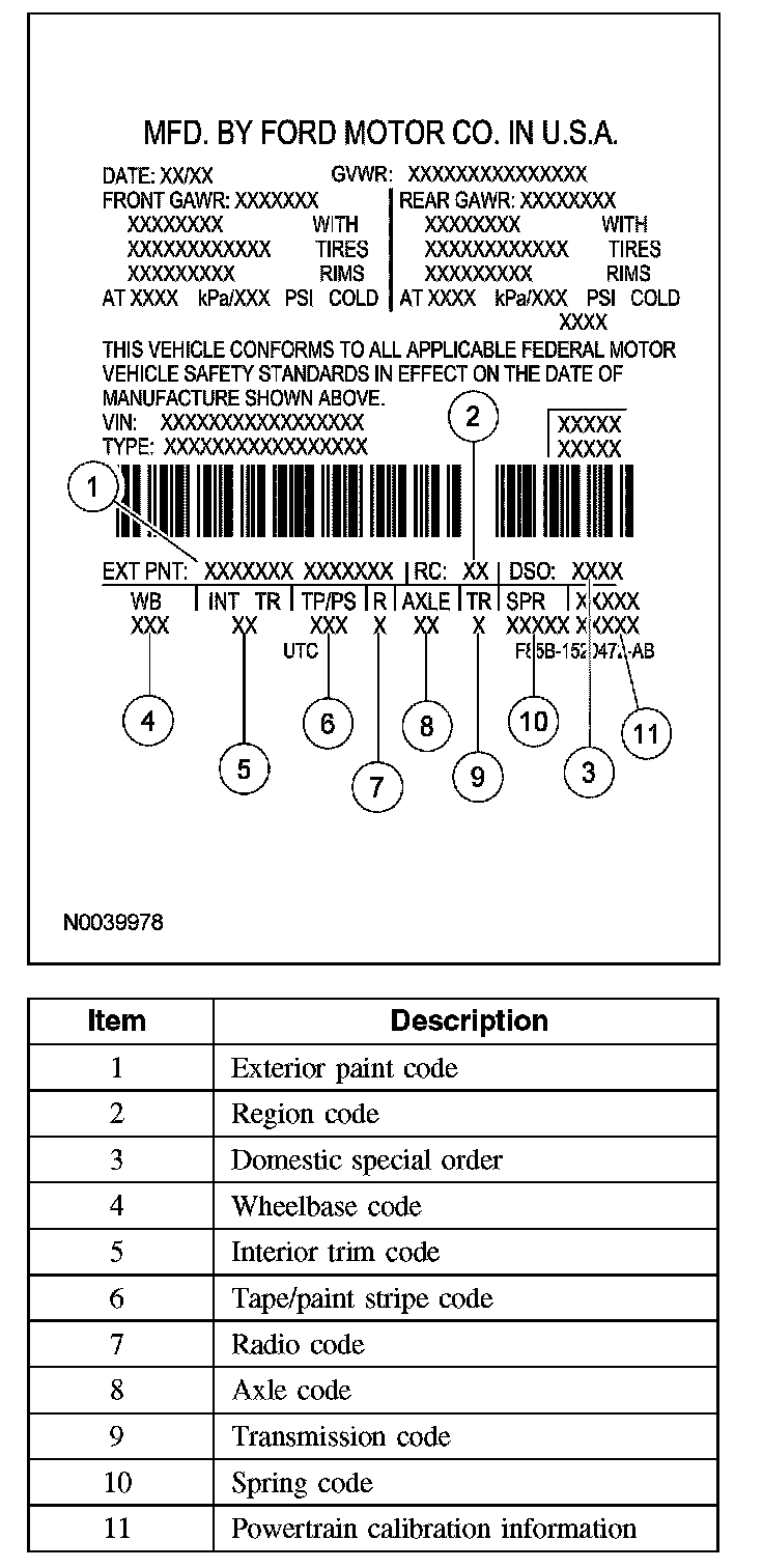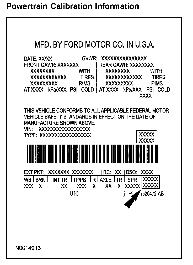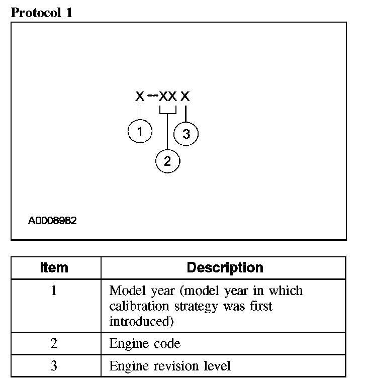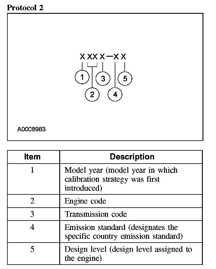 Powertrain calibration information is printed in the lower right corner of the vehicle certification (VC) label. Only base calibration information is printed. Revision levels will not appear, however, they can be found in On Line Automotive Service Information System (OASIS). For the current model year, Ford Motor Company is using 3 different protocols which describe powertrain base calibration. These protocols are designed to provide worldwide standardization for vehicle calibration. If the electronic calibration strategy was introduced in 1998 and carried into the current model year, Protocol 1 will be used. Refer to Protocol 1. If the electronic calibration strategy was introduced in 1999 and carried into the current model year, Protocol 2 will be used. Refer to Protocol 2. For electronic calibration strategy introduced in 2000 and beyond, Protocol 3 will be used. Refer to Protocol 3.