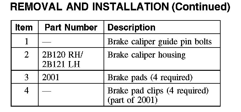 1. CAUTION: Do not allow grease, oil, brake fluid or other contaminants to contact the pad lining material. Do not install contaminated pads.