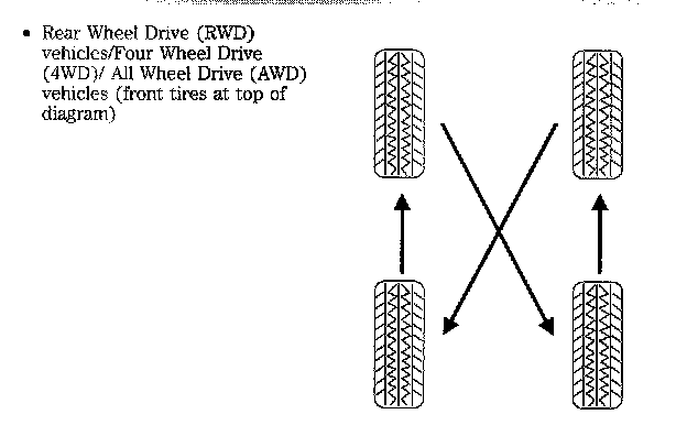 Note: If your tires show uneven wear ask an authorized dealer to check for and correct any wheel misalignment, tire imbalance or mechanical problem involved before tire rotation.