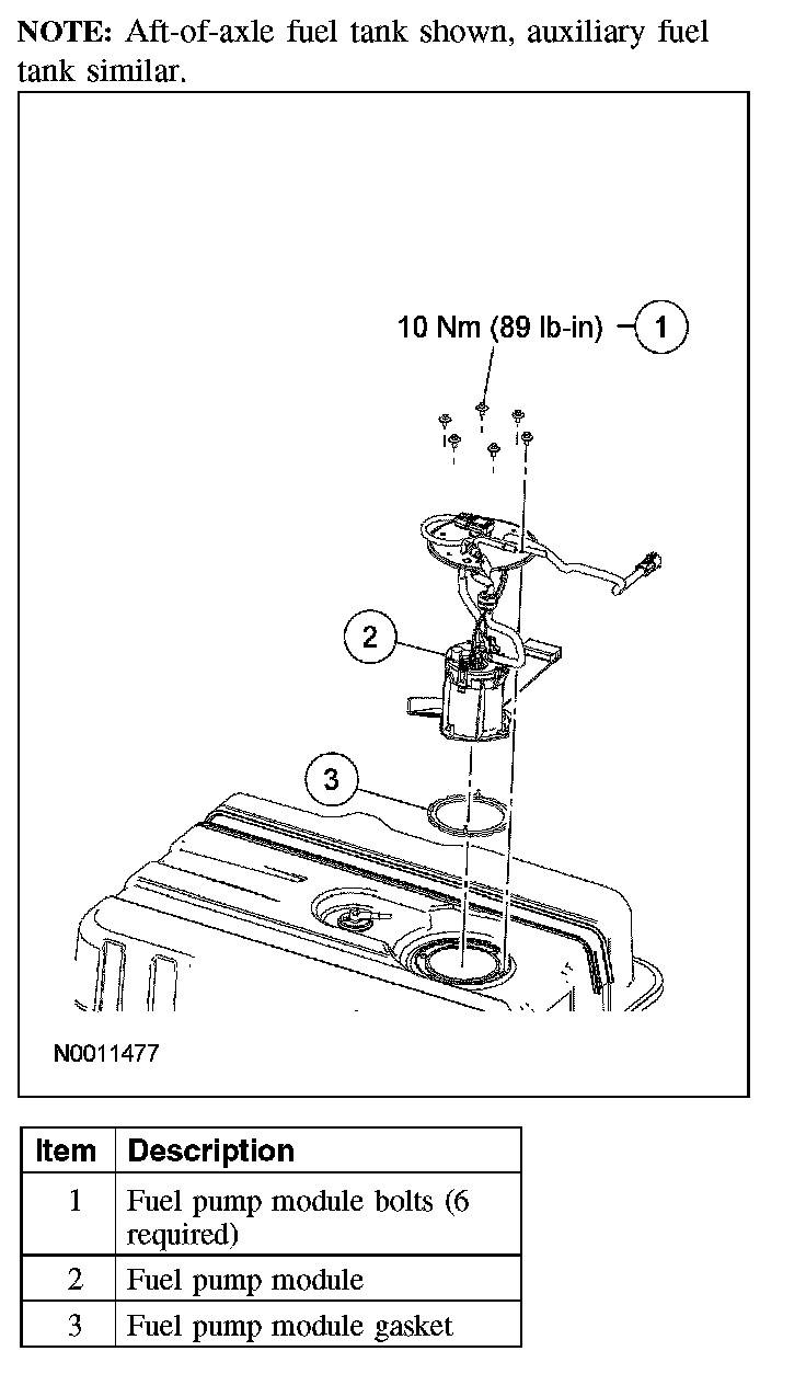 1. NOTE: The fuel tank must be drained completely. Upon removal of the fuel pump module, the tank must be inspected for contamination.