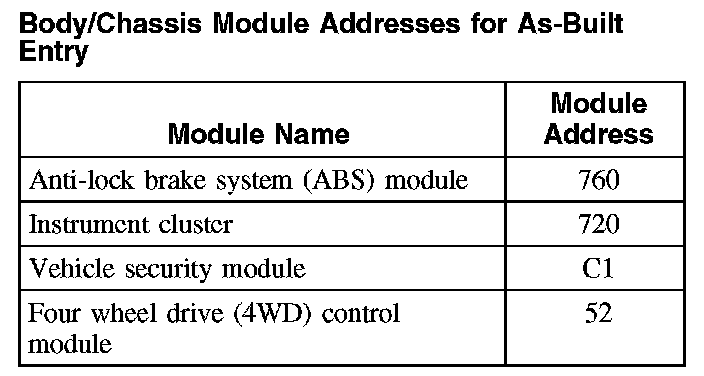 Body/chassis Module Addresses for As-Built Entry: