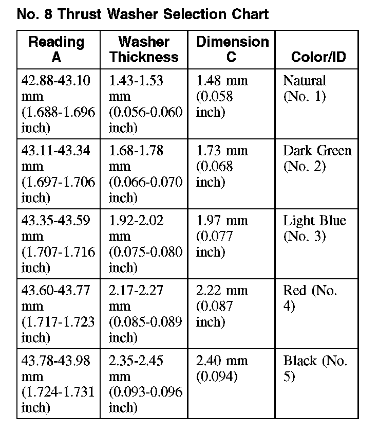 Use reading A to select the correct No. 8 thrust washer from the chart.