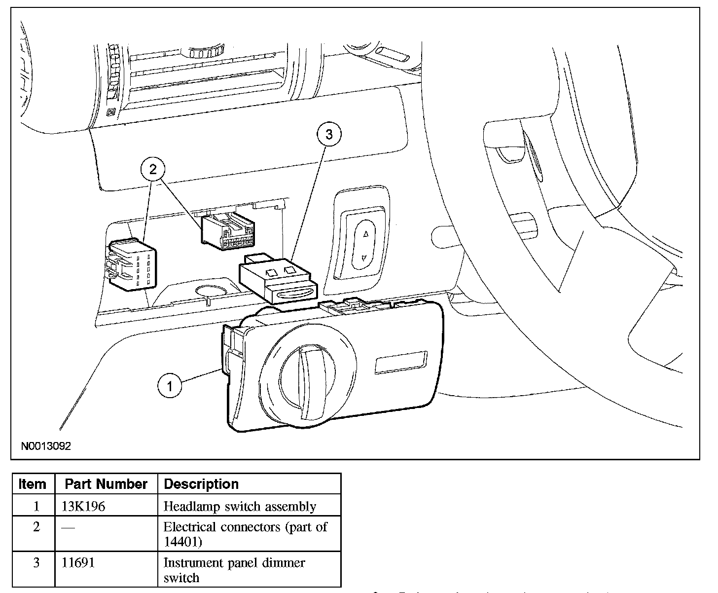 2. NOTE: The headlamp switch assembly is held in place by spring clips located on the headlamp switch.