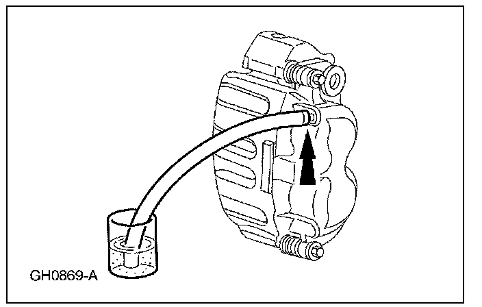 1. Remove the brake caliper bleeder screw cap and place a box-end wrench on the bleeder screw. Attach a rubber drain hose to the bleeder screw and submerge the free end of the hose in a container partially filled with clean, specified brake fluid.