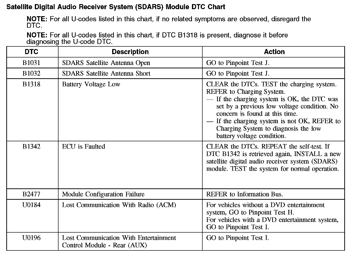 Satellite Digital Audio Receiver System (SDARS) Module DTC Chart