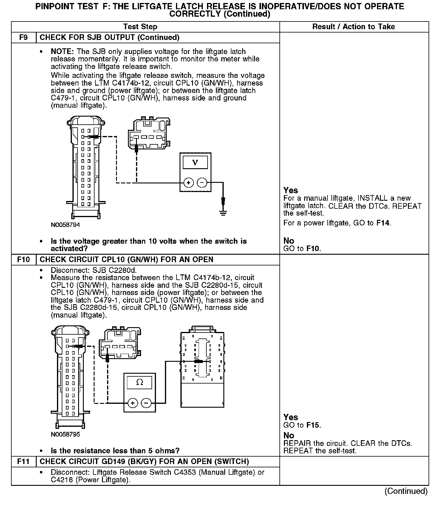 The SJB sends a voltage signal to the liftgate release switch through circuit CPL45 (BN). When the switch is activated, the signal is routed to ground through circuit GD149 (BK/GY). When the SJB detects a request from the liftgate release switch, the SJB provides voltage through circuit CPL10 (BN/BU) to the liftgate latch (vehicles equipped with a manual liftgate) or the liftgate/trunk module (LTM) (vehicles equipped with a power liftgate). For vehicles with a manual liftgate, ground for the liftgate latch is provided through circuit GD149 (BK/GY).