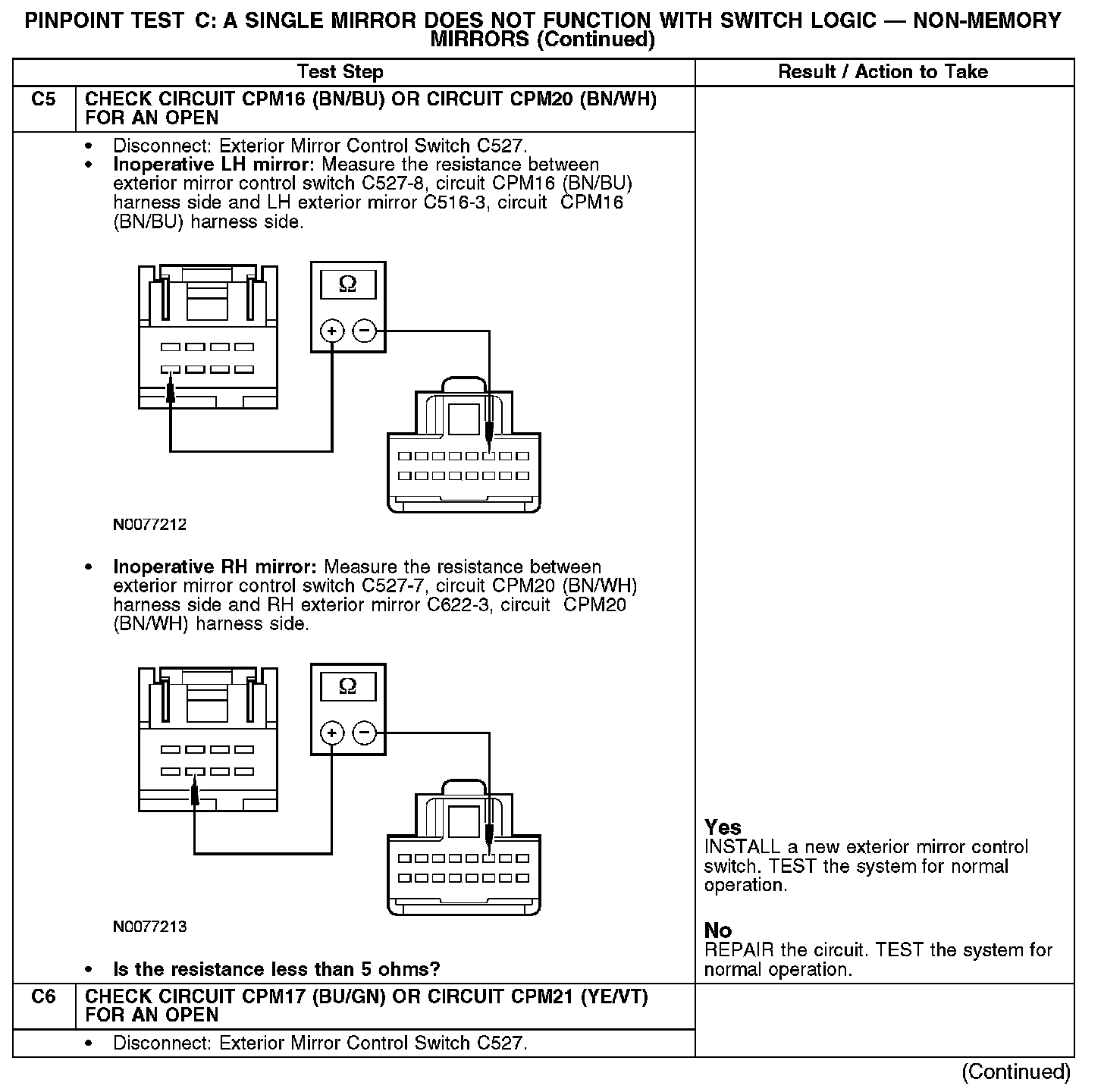 - When LH/RH exterior mirror motor receives ground through circuit CPM16 (BN/BU) or CPM20 (BN/WH) and power through circuit CPM23 (GY), the LH or RH exterior mirror motor will operate left.