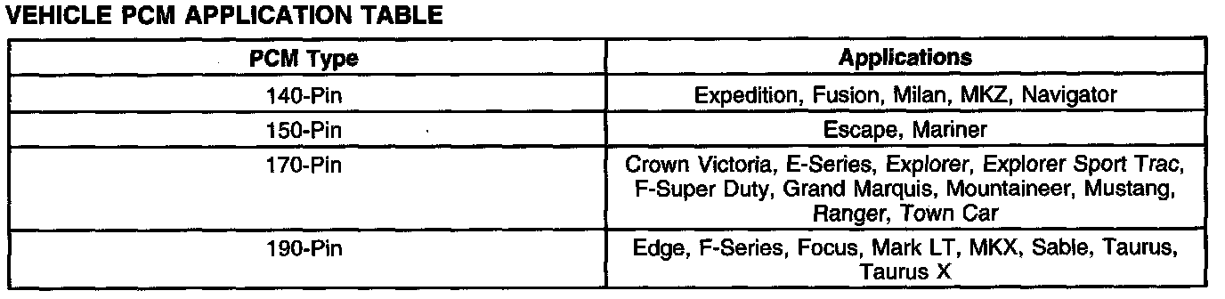 Vehicle PCM Application Table: